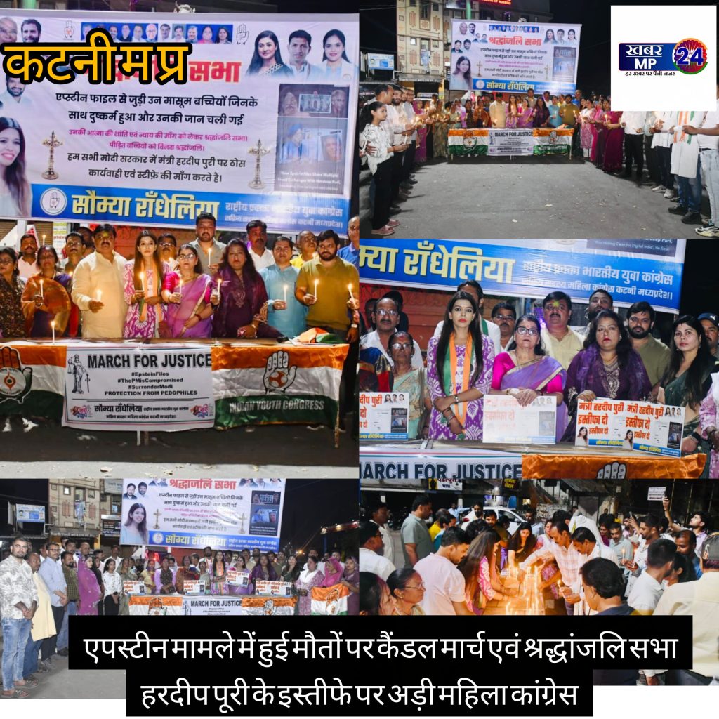 खबर एमपी 24 कटनी संवाददाता:- अंतरराष्ट्रीय महिला दिवस पर महिला कांग्रेस की राष्ट्रीय अध्यक्ष अलका लांबा एवं प्रदेश अध्यक्ष रीना बौरासी सेतिया के निर्देश पर युवा कांग्रेस की राष्ट्रीय प्रवक्ता सौम्या राँधेलिया ने कचहरी चौक कटनी से वैश्विक स्तर पर हुए अमानवीय कृत्य एप्स्टीन फाइल्स में हुई निर्दोष बच्चियों की हत्या के विरोध में कैंडल मार्च निकाला एवं श्रद्धांजलि सभा का आयोजन कर दरन्दगी का शिकार हुई मासूम बच्चियों को श्रद्धांजलि अर्पित की।बड़ी संख्या में महिला नेत्रियों एवं कांग्रेस जनों ने हाँथों के मोमबत्ती एवं भाजपा सरकार में केंद्रीय मंत्री हरदीप पुरी स्टीफ़ा दो की तख्तियां हाँथ में लेकर मार्च निकाला।सौम्या राँधेलिया ने बताया कि वैश्विक स्तर पर अत्यंत निंदनीय एपस्टीन फ़ाइल्स के खुलने से मानवता शर्मसार हुई है,उसमे भारत के केंद्रीय मंत्री हरदीप पूरी का कई बार ज़िक्र आया है और उनकी संलिप्तता के प्रमाण प्राप्त हुए है परंतु उसके बाद भी देश के प्रधानमंत्री नरेंद्र मोदी द्वारा उन्हें पद से बर्खास्त नहीं किया जा रहा है,महिला कांग्रेस निरंतर मंत्री के इस्तीफे को लेकर प्रदर्शन करती रहेगी।श्रद्धांजलि सभा एवं मार्च के दौरान मुख्य रूप से शहर कांग्रेस अध्यक्ष अमित शुक्ला,वरिष्ठ नेता राकेश जैन,प्रदेश युवा कांग्रेस सचिव दिव्यांशु अंशु मिश्रा,संगठन मंत्री प्रेम बत्रा,राजा जगवानी,कमल पांडेय,संजय गुप्ता,कोषाध्यक्ष राहुल होतवानी,श्याम पहुजा,विनीत जायसवाल,मंगल सिंह,मुस्ताक भाई,श्याम यादव,अजय जैसवानी,राहुल पटेरिया,शशांक गुप्ता गोलू,अजय खटिक,सचिन गर्ग,सूर्यकांत कुशवाहा,अजय कोल,लता कनोजिया,मीनाक्षी वल्लवी,नीरा सोनी,मुमताज बानो,हेमा शर्मा,रश्मि अग्रवाल,मनीषा सोलंकी,लता खरे,प्रीति पांडे,तमन्ना पांडे,जितेंद्र गुप्ता,अभिषेक प्यासी,अनुराग दाहिया,संजय गुप्ता,हरीश यादव,देवांश बाजपेई, श्याम यादव,विजय मंगल चौधरी,रमेश अहिरवार सहित बड़ी संख्या में कांग्रेस जन उपस्थित रहे।