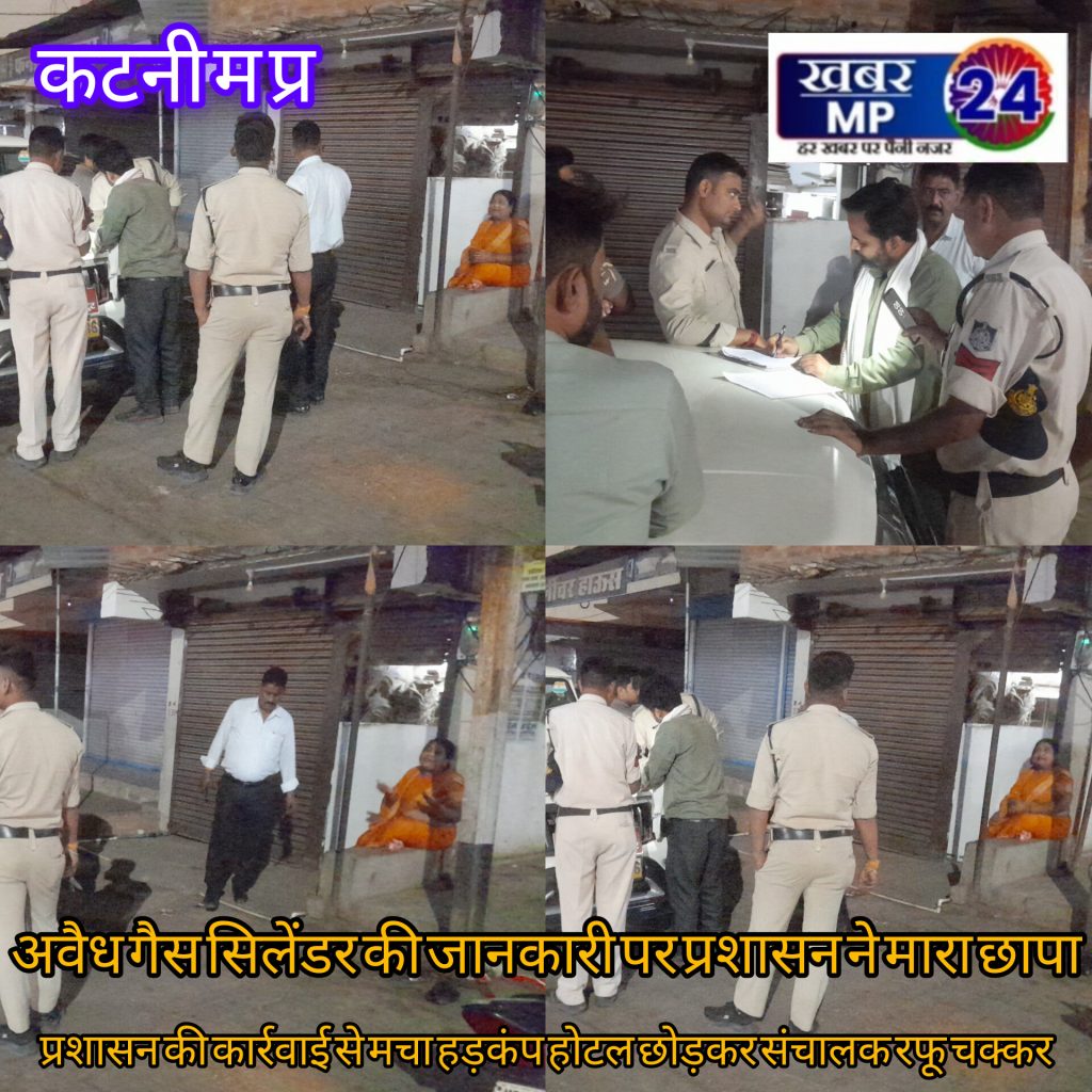 Khabarmp24 कटनी संवाददाता:- कटनी के बरही में एक होटल संचालक के घर के सामने अवैध सिलेंडर का वीडियो वायरल होने के बाद प्रशासन के द्वारा छापामार कार्रवाई की गई इस दौरान नायब तहसीलदार श्रीवास्तव एवं पुलिस मौके पर पहुंची है प्रशासन की कार्रवाई से हड़कंप मच गया। जानकारी के अनुसार नगर के विजयराघवगढ रोड पर बुधवार मुन्नू अग्रवाल के घर के सामने अवैध गैस सिलेंडर का वीडियो बनाकर अज्ञात व्यक्ति ने वायरल कर दिया। जानकारी लगते ही नायब तहसीलदार श्रीवास्तव एवं पुलिस शाम 7:00 बजे मौके पर पहुंचे। जांच के दौरान कुछ भी नहीं मिला,इस दौरान पंचनामा कार्रवाई की गई,वहीं होटल संचालक को छापामारी की जानकारी लगते ही मौके से भाग खड़ा हो गया। प्रशासन की कार्रवाई से नगर में हड़कंप मचा है। गौरतलब है कि इसके पूर्व दो होटल पर प्रशासन के द्वारा छापा मार कार्रवाई करते हुए अवैध सिलेंडर जप्त किए गए थे बहरहाल प्रशासन के द्वारा मामले की जांच पड़ताल की जा रही है।